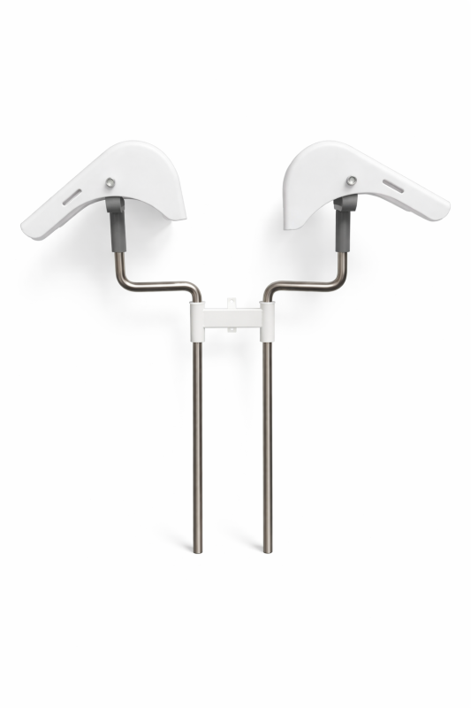 Undvik röra och skadade knästöd i vardagen. Detta väggfäste är utvecklat för säker och platsbesparande förvaring av knästöd/stigbyglar, när de inte är monterade på undersökningsbritsen. En enkel lösning på ett välkänt problem i kliniker där britsen används för både gynekologiska och vanliga undersökningar.
